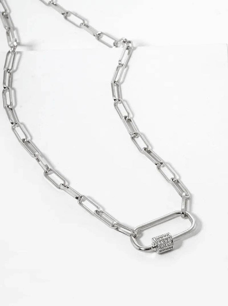 18K Gold Dipped Cz Pave Carabiner Pendant Chain Necklace: Rhodium