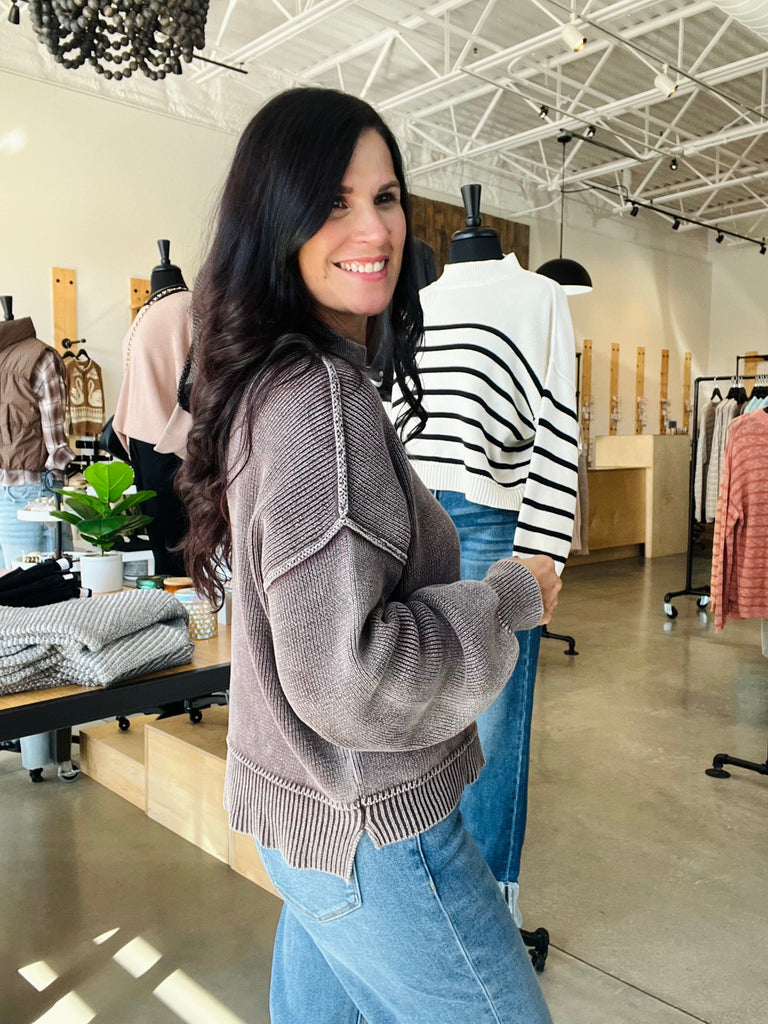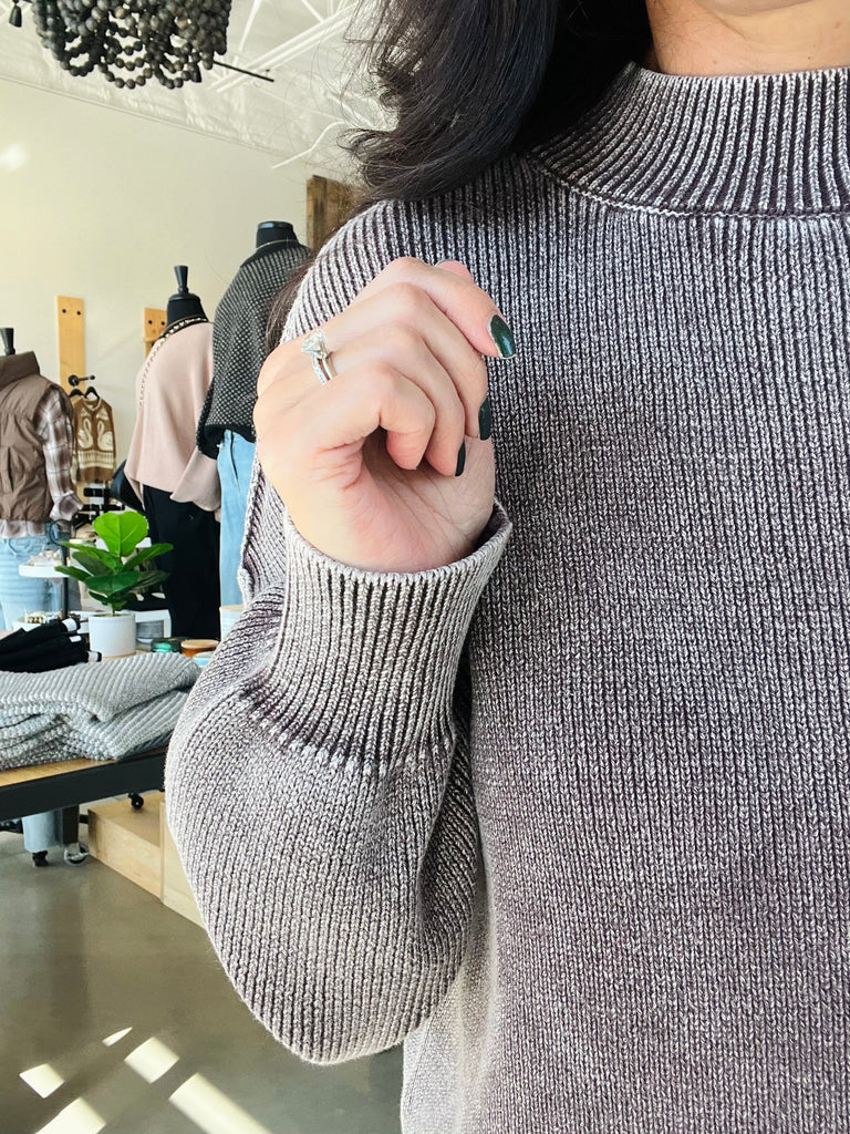 Bring a playful twist to cozy style with this washed mock neck sweater. Featuring long sleeves and a relaxed drop shoulder fit, its acid-washed pattern offers a unique look where tones may vary, making every sweater one of a kind. Perfect for adding a fun, casual vibe to your knitwear collection.