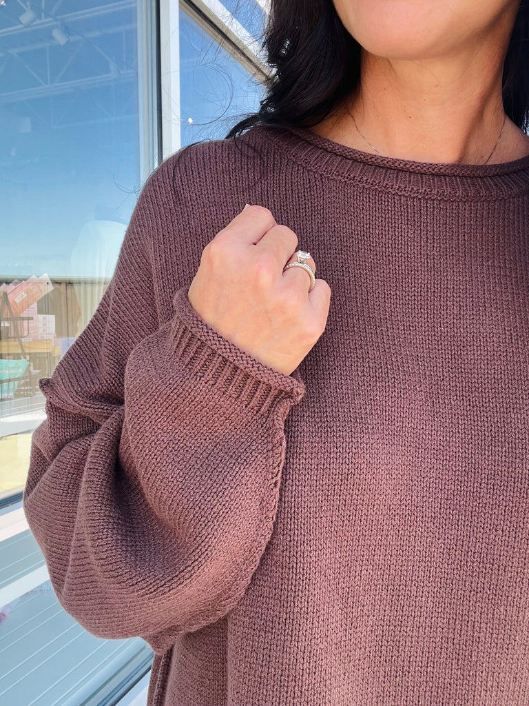 Get wrapped up in playful comfort with this oversized sweater. Its round neckline and extended drop shoulders create a relaxed, cozy vibe, while raw edge details add a cheeky touch of cool. Finished with ribbed trim and a solid knit design, this pullover is perfect for layering up and keeping things effortlessly fun.