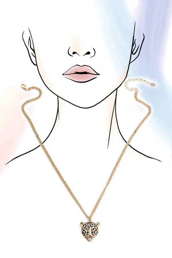 Our Leopard rhinestone drop designed to add a wild touch of bold fashion. Our necklace features leopard with rhinestone lip. This will look great on rompers or dresses.