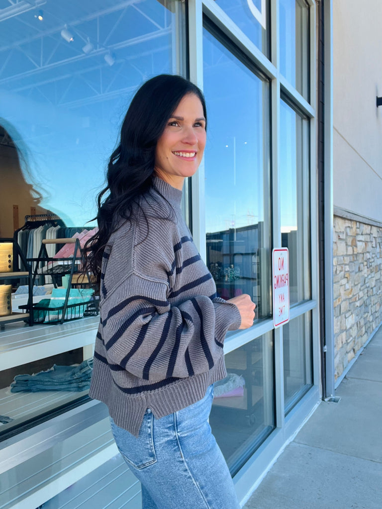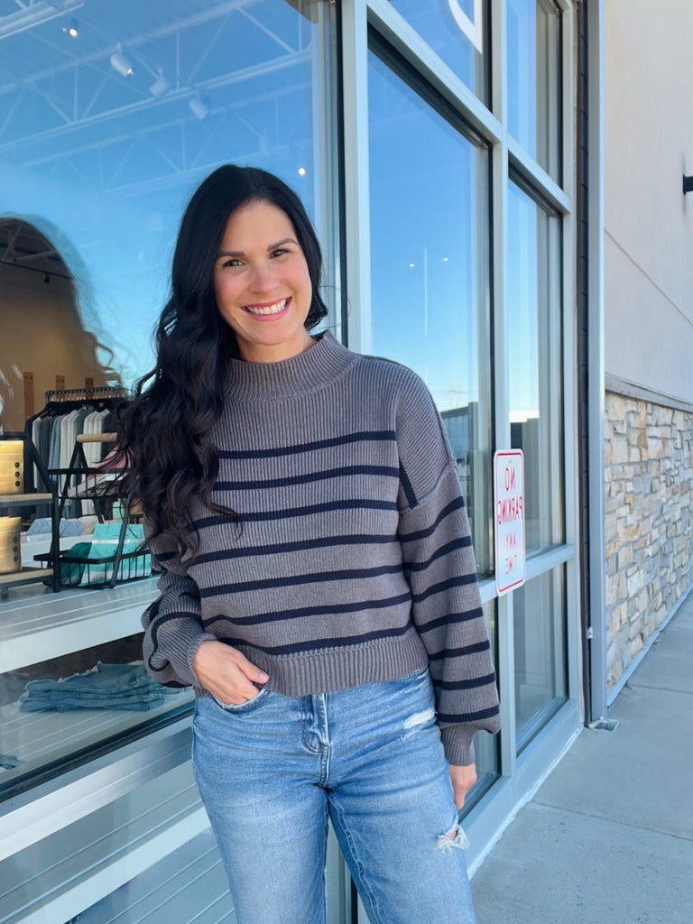 Stipe Mock Neck Drop Shoulder Sweater - Charcoal/Navy