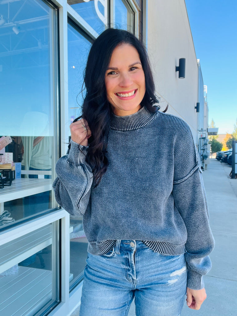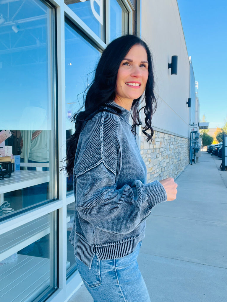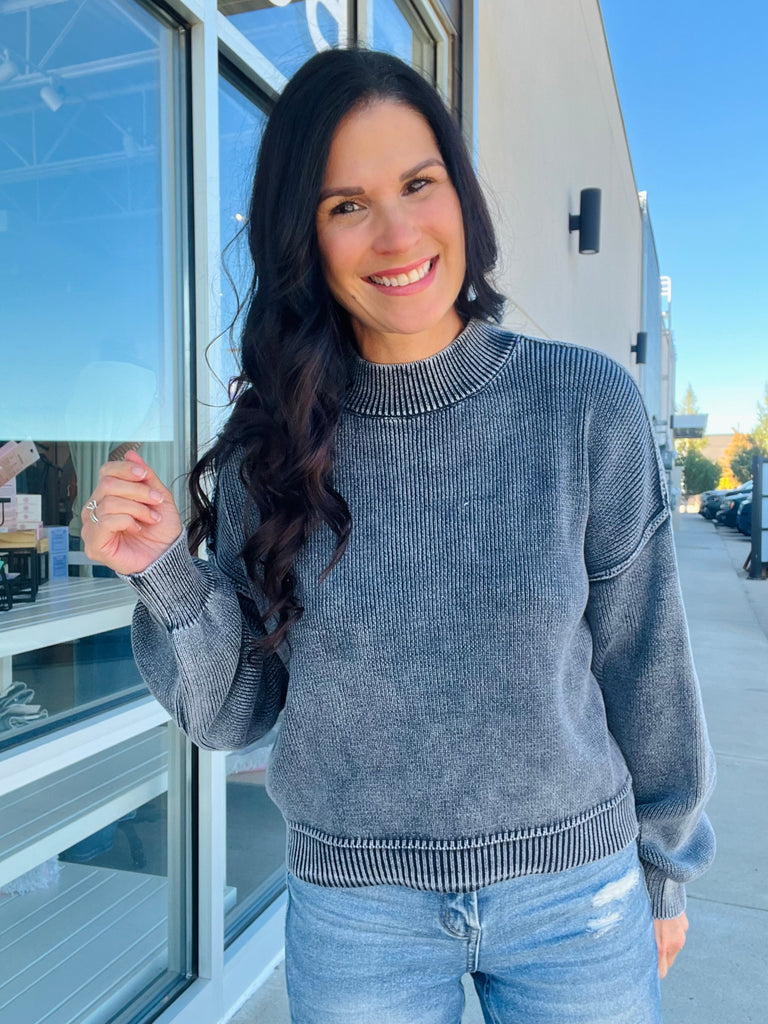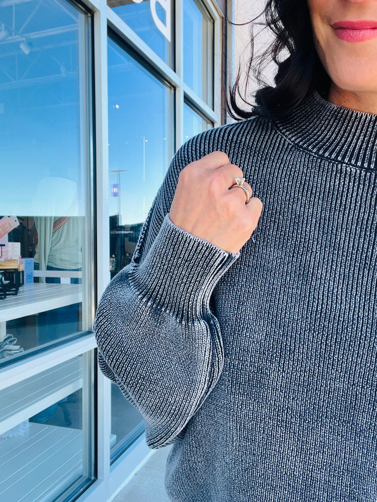 Bring a playful twist to cozy style with this washed mock neck sweater. Featuring long sleeves and a relaxed drop shoulder fit, its acid-washed pattern offers a unique look where tones may vary, making every sweater one of a kind. Perfect for adding a fun, casual vibe to your knitwear collection.