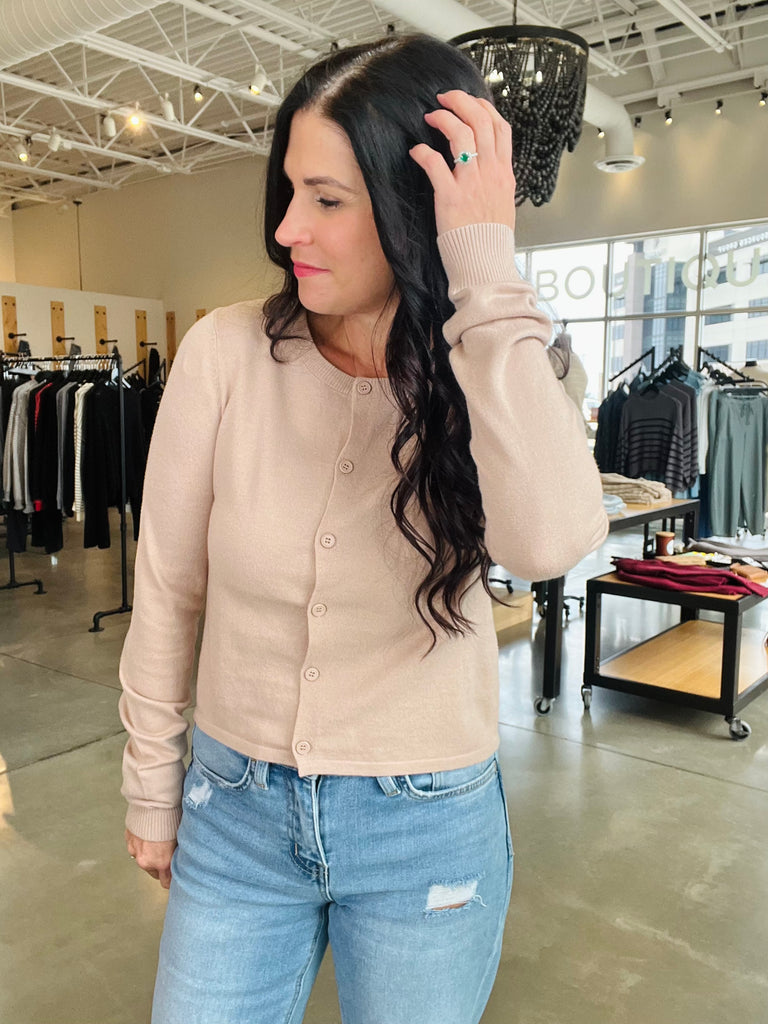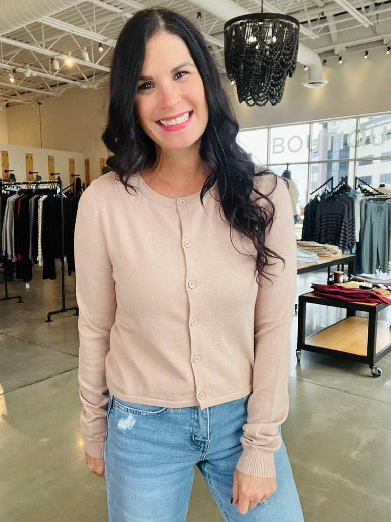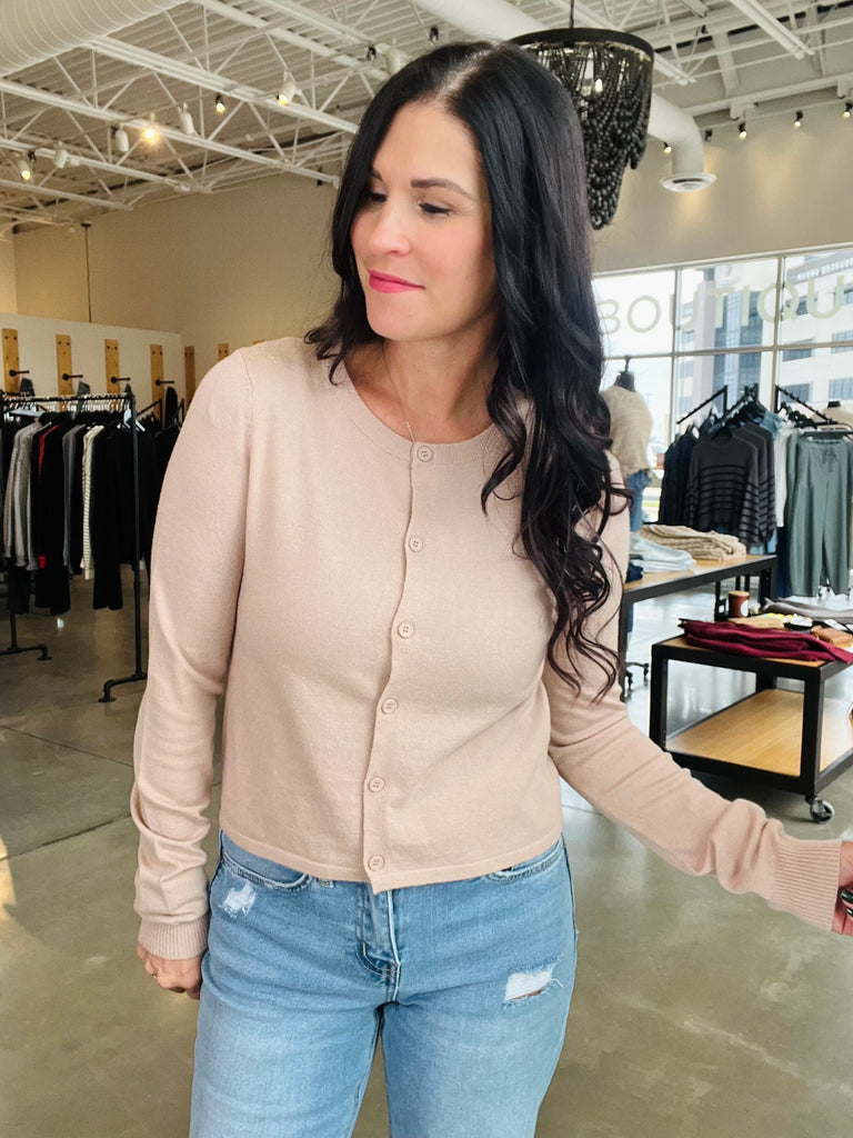 This Button Up Cardi is a classic. It's your go-to slim-fit cropped cardigan that adds a flirty twist to any outfit. Its sleek, form-fitting design hugs your silhouette, while the cropped length keeps things fun and fresh. Perfect for layering or wearing solo, it’s a playful way to stay cozy without sacrificing style.