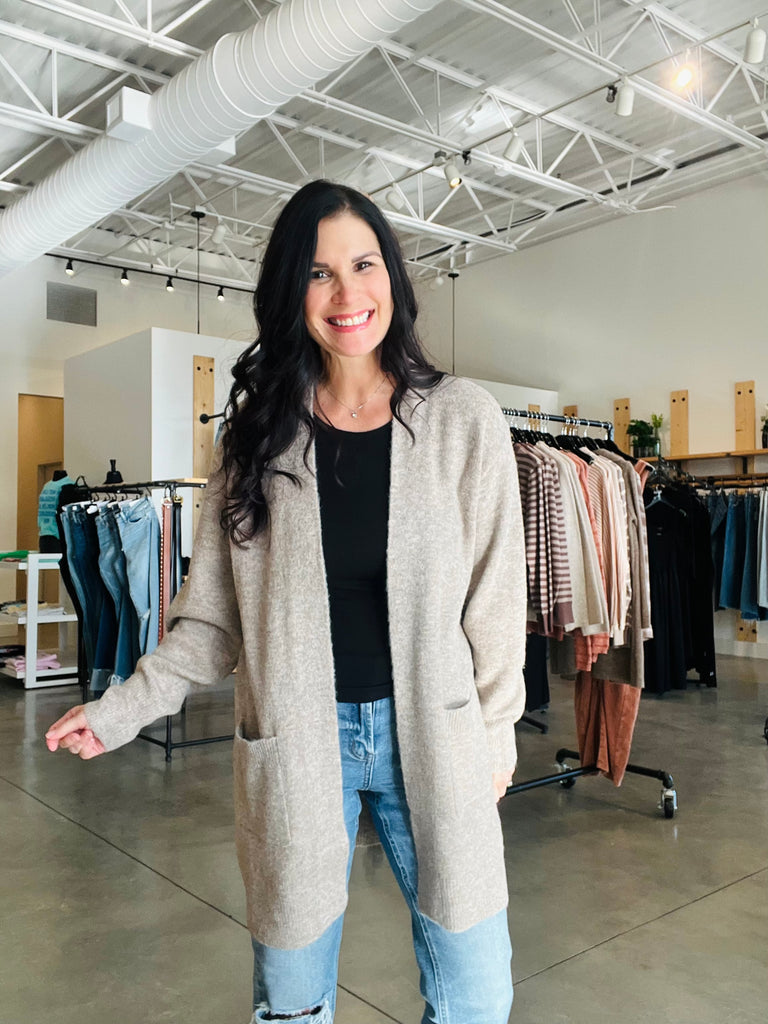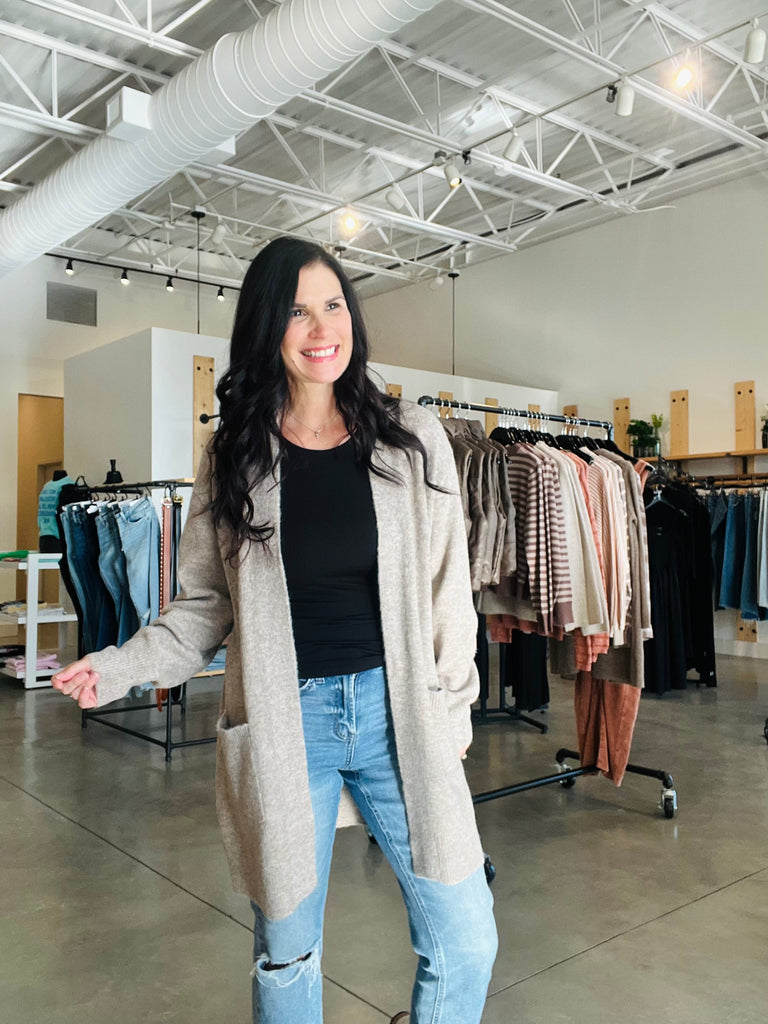Wrap yourself in effortless style with this marled mocha cardigan that's basically a hug you can wear. The long, open-front design layers beautifully over everything, while practical pockets keep your hands happy and your essentials close. Soft and cozy, it's the perfect throw-on piece for those moments when you need comfort without the fuss.