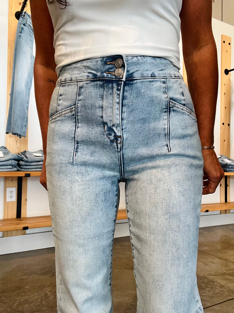 Step into effortless style with the Mica High Rise Relaxed Flare featuring a playful double-button detail. Designed to sit comfortably at your waist, these flares offer a relaxed fit that flows beautifully from hip to hem, perfect for twirling through your day with confidence and ease. Embrace the flattering silhouette...