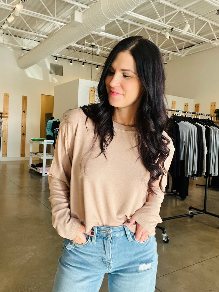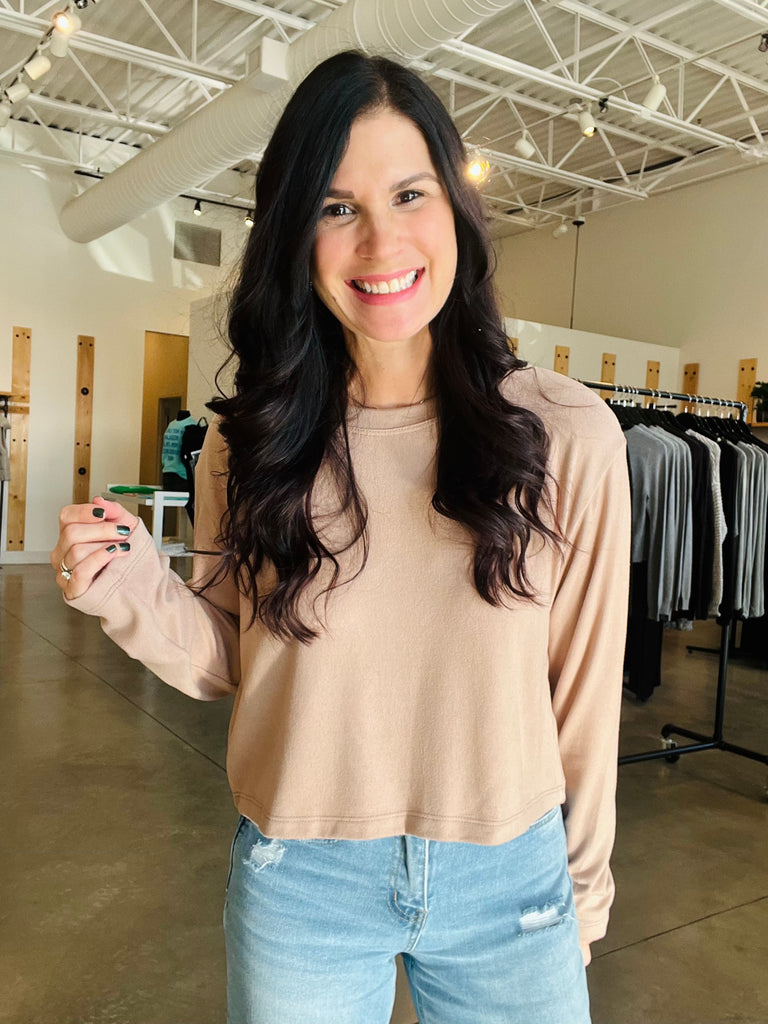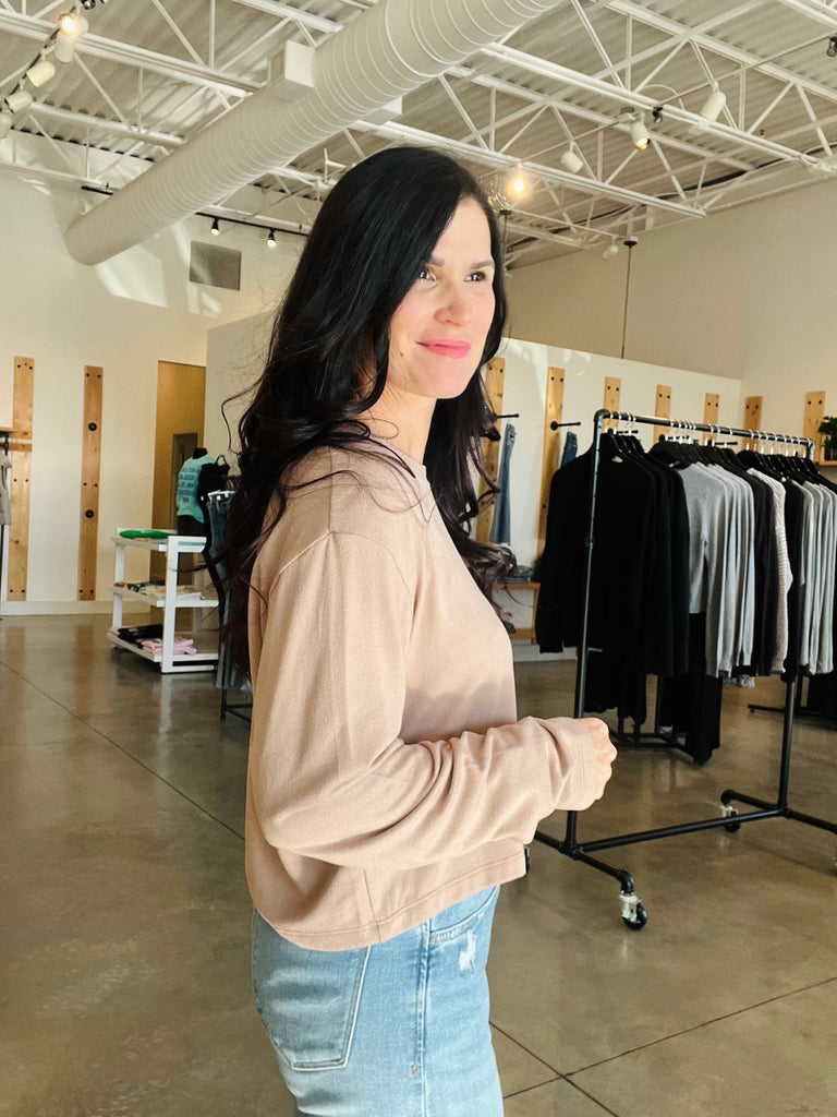 This soft, round-neck boxy cropped long sleeve top adds a fun twist to your casual wardrobe. Its relaxed fit and cozy fabric make it perfect for playful layering or pairing with high-waisted jeans. Embrace comfort with a trendy edge every day.